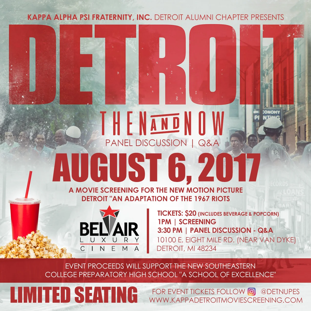 Immediately following the screening Kappa Alpha Psi Fratetnity, Inc. - Detroit Alumni Chapter will host a Then & Now Panel Discussion with Q&A to discuss the effects of the 1967 riots had on Detroit. Event tickets are $20, which includes a complimentary beverage (refills) and popcorn. A portion of the event proceeds will support the new Southeastern College Preparatory High School. We cordially invite you to join us for an excellent opportunity to be informed and entertained on an important period in Detroit History.